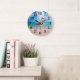 This round shape wall clock is shown with a photo print of a beautiful flamingo beachside.