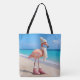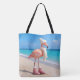 A charming flamingo, adorned with a cozy knit hat, scarf, and pink boots, is gracefully standing on a picturesque tropical beach