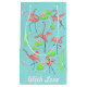 Lebhafte rosa Flamingos flattern ihre Flügel und kräuseln ihre Federn gegen einen blauen wässrigen Hintergrund mit Schilfen und Wasserlilien. Ein stilvoller Entwurf mit einer retro Touch, die mit Ihrem eigenen Text, Bildern und Ideen personalisiert sein kann. Ein ursprüngliches digitales Kunstbild geschaffen durch schrulliges Chic.