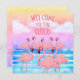 Flamingos auf Parade Flat Grußkarte. Eine lustige Party Einladung für deinen Lieblings-Flamingo-Liebhaber. Tropische Natur, Strand, Vögel, inspiriert Tiere. Wasserfarbene künstlerische Aufnahme in die Familie, Adoption, Unterhaltung, Geburtstagspartys oder andere Veranstaltungen. Behalt das humorvolle Zitat "Willkommen in der Flock!", ändere es und füge deine Details hinzu.