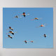 Flamingos in flight (Phoenicopterus ruber) auf dem blauen Himmel, in der Camargue ist eine natürliche Region südlich von Arles, Frankreich, zwischen dem Mittelmeer und den beiden Armen des Rhône-Deltas