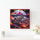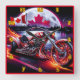 Ein auffallendes Motorrad mit feurigen Akzenten zeigt die kanadische Fahne, das Set vor einem pulsierenden Nachthimmel und das ruhige Wasser.