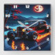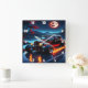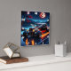Ein klassisches frisierte Auto, das am See unter einem glühenden Mond wütet, seine feurigen Flammen stehen im Kontrast zu den ruhigen Gewässern und schattigen Bergen. Die lebhaften Farben entzünden die friedliche Nacht.