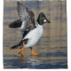 Männliche Goldeneye-Ente, die sich auf Eis klopfen.Foto mit rutschigem Jolly sehen auch passende Produkte.