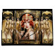 Ein schönes Rotkopfflapper-Mädchen trägt ein vergoldetes Oberteil mit vergoldeten Imitaten und ein Kopfband, das vor schwarzem Hintergrund funkeln und glänzen scheint. Sie trägt einen dicken schwarzen Augenlider und einen dunkelroten Lippenstift, der ihre Porzellanhaut ins Licht zu strahlen scheint und ist gerahmt ein Retro, Art Deko Stil verzierte Imitate Goldrahmen. Daneben gibt es drei glamouröse Flapper-Tänzer in satin-goldenen figurumarmten Kleider. Sie treten auf eine Bühne, die kurz davor ist, die Nacht zu tanzen. Dieses Design ist ideal für einen "großen Gatsby", "brüllende Zwanziger", Flapper Girl-Thema Geburtstag, Brautparty, Hochzeit oder Jubiläum der 20er Jahre. Ideal auch für decoupage- und Scrapbooking-Projekte.