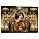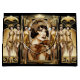 Ein schönes brünettes Flapper-Mädchen trägt ein vergoldetes Oberteil mit vergoldeten Imitaten und ein Kopfband, das vor schwarzem Hintergrund funkeln und glänzen scheint. Sie trägt einen dicken schwarzen Augenlider und einen dunkelroten Lippenstift, der ihre Porzellanhaut ins Licht zu strahlen scheint und ist gerahmt ein Retro, Art Deko Stil verzierte Imitate Goldrahmen. Daneben gibt es drei glamouröse Flapper-Tänzer in satin-goldenen figurumarmten Kleider. Sie treten auf eine Bühne, die kurz davor ist, die Nacht zu tanzen. Dieses Design ist ideal für einen "großen Gatsby", "brüllende Zwanziger", Flapper Girl-Thema Geburtstag, Brautparty, Hochzeit oder Jubiläum der 20er Jahre. Ideal auch für decoupage- und Scrapbooking-Projekte.
