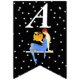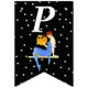 Diese Fahne geformt Banner Happy Birthday Banner ist schwarz mit weißen Sternen und eine flapper Lady mit roten Haaren in einem blauen Kleid sitzend auf einem Regal wirbelt ihre Perlen mit dem Mond hinter ihr. Passen Sie das Geburtstagsjahr und den Text mit den Vorlagen an.