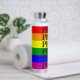 Diese Wasserflasche hat die Regenbogenfarben der Pride-Fahne umwickelt. Auf der Vorderseite haben alle sechs Farben das Wort "PRIDE" über bedruckt. Die Thor Kupfer Vakuum Insulated Flasche ist in drei Flaschengrößen erhältlich, 22oz, 25oz und 32oz. Auch diese Wasserflasche kommt in vier Farben weiß, Marine, Silber und Schwarz.