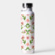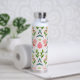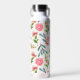 Diese Wasserflasche hat einen weißen Hintergrund mit rosa Blume.