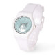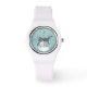 Schöne Ladys' Flat Earth Map im türkisfarbenen 'Sea' mit weißem 'South Ice' Ring und 'Polar' White Bezel, Hour & Minute Hands und Strap. Bild zeigt die Licht- und Bewegung der Sonne um die flache Oberfläche der Erde und der Kontinente. Erhältlich in der Black oder White Watch Band.