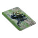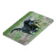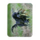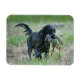 Ein nasser Flatbeschichteter Retriever, der eine Ente auf einem flexiblen Foto Magneten an den Master zurückbringt.