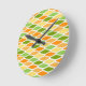 Diese Wanduhr hat ein modernes Design aus geflochtenen Diamanten in Gelb-, Orange- und Grüntönen.