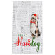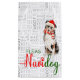 Ein dreisprachiger australischer Schäferhund sitzt mit niedlicher roter Weihnachtsmannmütze und ein rot-weiß gestreifter Schal ist bereit, Fleas Navidog jedem Hundefreund oder Liebhaber der Aussie-Rasse zu wünschen.