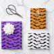 Ein Set aus Verpackungspapier mit einem Halloween-Fledermausmuster auf lila, orangefarbenen und hellen Orangenhintergründen. Anpassen der Hintergrundfarbe, der Mustergröße unter anderen Optionen.