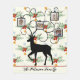 ** Design: A rustic and festive design featuring a black reindeer silhouette against a patterned background of holly, berries, snowflakes, and stars. The antlers are stylized into swirling branches with integrated hooks or frames for displaying multiple pictures.