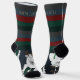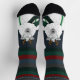 A pair of fun, cute, funny, festive, cosy-up, socks that have a fun winter cartoon sheep doodle illustration on the top and bottom, on a deep, dark, blue gradient background, with a striped pattern with a warm colors, on the top.