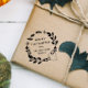 Niedliche Halloween-Briefmarke für eure Halloween-Geschenke und Halloween-Favoriten mit Happy Halloween aus eurer Familie geschrieben in einem Kranz aus Grün, Geist und niedlichen Fledermäusen.