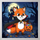Hochwertige Grafik eines niedlichen Cartoon-Fuchses, der als Vampir zu Halloween gekleidet ist und einen Kürbiseimer mit Süßigkeiten überflutet.