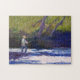 Fliegen Sie Fischercasting in einem Strom und in den hetzenden Quellenwassern, dem Grün und dem Blau waten. Fischenkunst durch REIFSNYDER. Puzzlespielbild.