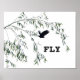 Ein schwarzer Vogel fliegt von seinem wilden Zweig ab. Ein einfaches Bild in der Nähe der Silhouette. Wählen Sie Ihre eigene Hintergrundfarbe aus.