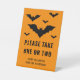 Ein personalisierbares Halloween-Süßigkeitsschild, das sich ideal zum lass von Trick eignet, oder die Wächter wissen, dass sie eine oder zwei Leckereien nehmen können. Das Design ist mit Desteis einfacher Silhouette-Form-Design von fliegenden Fledermäusen in verschiedenen Größen. Die Hintergrundfarbe ist orange. Es gibt auch einen personalisierbaren Textbereich, um glückliches Halloween zusammen mit einem Namen zu wünschen.