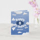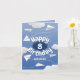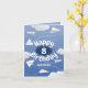 Diese skurrile Geburtstagskarte für einen Jungen oder ein Mädchen enthält verschiedene illustrierte gefaltete Weißpapierflugzeuge gegen einen blauen Himmel mit puffigen Wolken, die die Nachricht "Happy Birthday" umrahmen - das Alter und den Namen des Kindes auf der Vorderseite und die Botschaft auf der Innenseite anpassen - von katz_d_zynes