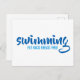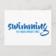 Das Wort "Schwimmen" ist in einem lustigen blauen typografischen Text mit den Schwimmstilen von Fliege, Rücken, Brust geschrieben und kostenlos unten in einem leichteren blauen Text geschrieben.