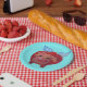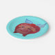 niedliches fettes Fliegenrosaschwein mit kleinen blauen Flügeln stellt eine große Papierplatte her, falls Schweine fliegen können.