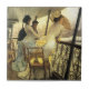 Fliese James Tissots Portsmouth. Ölmalerei auf Leinwand ab 1877. Französischer Maler James Tissot verbrachte viel seines Lebens in England, das herrliche Arbeiten viktorianische Kultur überprüfend malt. Portsmouth (die Galerie von H.M.S. Kalkutta) ist eine Arbeit, die zwei junge Frauen und einen jungen Seemann lounging ist auf dem Geländer eines Bootes im Hafen darstellt. Die elegante viktorianische Küste der Abnutzung mit zwei jungen Frauen kleidet mit fest geschnürten Korsetts und voller hastiger Geschäftigkeit an. Eine Frau trägt einen großen gelben Bogen, während die andere Babyblaubögen trägt, beide tragen extravagante Hüte und einen Griff ein sehr großer Fan. Einige Klappstühle sitzen leeres hinteres sie, während sie auf dem Geländer sich lehnen, und der Seemann hält kühl seinen Kopf in seiner Hand. Ein schönes Geschenk für Fans von Tissot, von viktorianischer Kunst, von Vintagen Bootsmalereien und Realismus von des 19. Jahrhunderts.