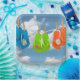Farbenfrohe Flip-Flops an einer Wäscheleine mit Blume und Sommerhimmelhintergrund.