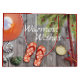 Diese herzliche Wünscheloase mit Postkarte bietet eine niedliche Mischung aus orangefarbenen Flip Flops und Sonnenhut. Muscheln und eine Aquarellpalme, die mit Weihnachtsbaumleuchten geschmückt sind, sind alle auf einem Holzboden angeordnet.