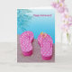 Pink und weiß polka dot flip-flops mit gelben daisy durch Schwimmbad für Ruhestand Glückwunsch.