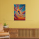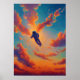 Colorful pointillist artwork of a lone figure floating through a glowing sunset sky. Thousands of vibrant dots create a luminous neo-impressionist atmosphere filled with dramatic clouds and radiant light.