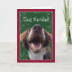 Humorvolle Weihnachtskarte kennzeichnet Foto eines glücklichen Hundes mit einem riesigen Lächeln auf einem Hintergrund des Weihnachtsrotes und -Grüntöne mit bokeh Effekt. Lustiges Wortspiel auf Feliz Navidad Gruß.