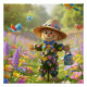 Fantasy whimsical scarecrow design poster. This design features a scarecrow with a straw hat and a watering can, her clothes full of pretty flowers, colourful birds fly over here head and she is stood in a field of beautiful flowers. This design is a cheerful design and would suit anyone who is a fan of whimsical art.