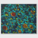 Desenho com fundo escuro semelhante a flores que foi submetida a diversos efeitos gráficos e ficou parecendo algo surreal que lembra algo de vidro de cor azul metálico e de partes douradas e que foram parcialmente trituradas.