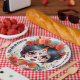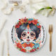 Rund um den äußeren Rand der Platte gibt es einen anpassbaren Textbereich, in dem Individuen ihre eigene persönliche Nachricht hinzufügen können. Der zentrale Teil der Platte zeigt das Kunstwerk "Flor y Calavera". Die Calavera Catrina ist groß, mit einer Fülle von roten und blauen Blumen geschmückt und bildet einen unberührten, weißen Hintergrund. Die Farben sind lebendig und auffallend, was eine visuell faszinierende Szene schafft. Insgesamt verbindet die runde Papierplatte den anpassbaren Textbereich wunderbar mit dem fesselnden Kunstwerk und ist somit eine personalisierte Ergänzung für alle, die Dia de Muertos feiern oder seine reiche kulturelle Bedeutung schätzen.