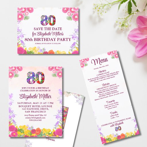 Floral 80. Geburtstag Einladung 80 elegante Karte