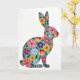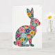 This card shows a right-facing, long-eared rabbit silhouette 🐇 set on a white background, its outline sharp and tidy against the open space. Inside the rabbit shape, a sage-green field holds a dense scatter of flowers and leaves, arranged like a garden tucked into a single figure. Petals in fuchsia, sunny yellow, sky blue, deep violet, and warm orange-red sit close together, with dark green leaves threading between them as if they’re leaning in for a friendly nudge 🌷. Some blossoms have tiny white dots on their petals or contrasting centers, adding little moments that feel like shared glances. Any greeting text would sit best above or below the rabbit in a soft green or charcoal tone so it doesn’t compete with the floral detail. The overall look nods to modern folk-style decoration, with the patterned interior feeling like a bouquet offered without words. The rabbit’s ear and back curve are filled edge to edge with the multicolored blooms and deep green leaves.