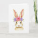 This card features a soft watercolor portrait of a long-eared bunny 🐰 centered on a bright white background, showing its head and upper chest in gentle cream and warm brown washes. The fur is painted with light gradients and feathery strokes that make it look touchably soft, while the dark, glossy eyes and tiny lashes give the bunny a tender, affectionate gaze, like it’s quietly leaning in. A small pink nose sits above fine curved whiskers, adding to the sweet, friendly expression. Resting on its head is a floral crown with a large pink rose in the middle, two lavender-purple blossoms to either side, and airy green leaves tucked between them 🌷. The overall scene feels like early spring, with translucent layers and thin lines that keep the details delicate rather than heavy. There is no text on the front, leaving the white space open and uncluttered around the bunny’s face. The crown’s pink rose shows layered petals with pale highlights, and the lavender flowers have soft violet centers fading into lighter edges.