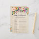 Unsere bunten Blume Baby Dusche Wort Rührei Spielkarten mit einem Vintagen Hintergrund hat 20 Wörter verdreht und alle Wörter sind mit Babys assoziiert. Sie können die Gäste zwanglos dieses Spiel spielen lassen (einfach selbst die Anfahrtsbeschreibung bearbeiten) oder Sie können es zu einem Wettkampf machen, indem Sie den Gästen eine gewisse Zeit geben, das Spiel zu beenden und denjenigen einen Preis zu geben, der zuerst fertig ist. ANTWORTEN: 1)Windeln 2)Babydusche 3)Tücher 4)Kinderzimmer 5)Decke 6)Schnuller 7)Karosserie 8)Sattel 9)Aktivitätsmat 10)Tether 11)Botinet 12)Flasche 13)Rinder 14)Stwalze 15)mobil 16)gefülltes Tier 17)Lotion 18)Pjamp als 19)Shampoo 20)Bouncer