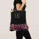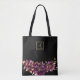 Elegante Lila Golden Floral Black Monogram Tote Bag. 3 blühende Blume in tiefroten, lila und goldenen Details und Blätter gruppieren sich in einem weichen Bogen auf dem Geliebten Teil auf der Vorderseite. In der oberen Mitte befindet sich ein schwarz-goldener Rahmen mit Ihrem Monogramm-Buchstaben und dem für Sie anpassbaren vollständigen Namen. Die Rückseite hat den gleichen individuellen Monogramm-Rahmen in golden. Eine solide Seite mit nur dem Monogramm zu haben macht die Tasche elegant vielseitig für jeden Anlaß, sowohl privat als auch bei der Arbeit. Ankommen in jeder Sitzung mit einem zusammenhängenden und gut durchdachten Erscheinungsbild für einen eindrucksvollen ersten Eindruck. Siehe Entsprechende Produkte mit demselben Design-Thema in der Auflistung. Mischung und Übereinstimmung