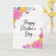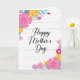 BlumenMuttertagskarte mit Blumenrahmen auf einem Holzboden mit dem Text "Muttertag glücklich!". Der Text auf der Innenseite der Karte kann personalisiert sein, um Ihre Mutter am Muttertag zu schicken.