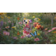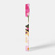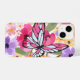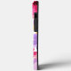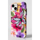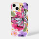 Ein lebhaftes Telefongehäuse mit einem großen, stilvollen Schmetterling in Rosa und Weiß, Set vor einem Hintergrund farbenfroher Blume. Das Design ist in lila, gelben und rosafarbenen Farbtönen gehalten und verleiht dem Ganzen ein lebendiges und fröhliches Ambiente.