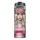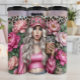 Eine auffällige Figur mit langgestrecktem, fließendem platinblondem Haar und durchstechenden blauen Augen hält einen eiskalten Kaffee. Sie trägt eine rosa Baseballkappe mit Blume, einem passenden rosa Oberteil und blauen Jeans. Sie wird von üppig rosa Pfennigfuchtern umgeben, Set vor einem strukturierten Hintergrund mit einem subtilen leoparden Druckmuster.