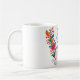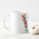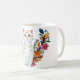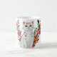 This medium-sized feline gazes directly at you with large, expressive yellow eyes, exuding a calm and friendly demeanor. Its pristine white fur is adorned with a vibrant tapestry of stylized leaves and flowers in bold shades of orange, pink, yellow, green, and blue, creating a decorative pattern that dances across its body.