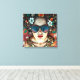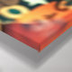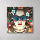 A woman lies on her back, wearing a crown of flowers and sunglasses that reflect a sunset scene.