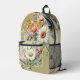 Hübscher floraler Rucksack in Olivgrün-Tönen. Bouquets von Gänseblümchen und Wildblumen schmücken alle Teile dieses großen Packs mit einem kleineren Reißverschluss vorne. Ideal für alle Naturliebhaber, die jede Art von Paraphernalia tragen müssen.