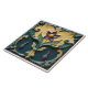 Jugendstil-Keramik-Fliesen mit einer kleinen lila Blume in der Mitte, gelbe Blätter und gelbe Details, dunkelgrüner Hintergrund, lila Buden Ohrringe und blumengeschmückte Wirbel.
