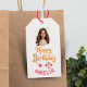 Floral Flowers Happy Birthday Handlettering Photo Gift Tags. Celebrate a special girl's birthday with this charming personalized gift tag! Featuring a hand-drawn floral design, cheerful "Happy Birthday" text in playful orange script, and a custom photo and name. Ideal for daughters, nieces, granddaughters, or friends.